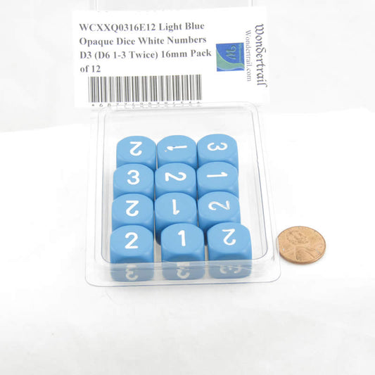 WCXXQ0316E12 Light Blue Opaque Dice White Numbers D3 (D6 1-3 Twice) 16mm Pack of 12
