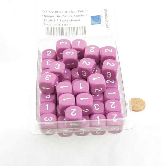 WCXXQ0327B1 Light Purple Opaque Dice White Numbers D3 (d6 1-3 Twice) 16mm (5/8in) Pack Of 100