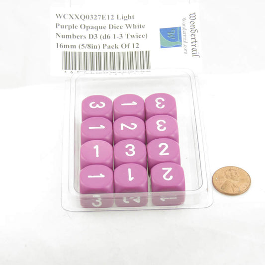 WCXXQ0327E12 Light Purple Opaque Dice White Numbers D3 (d6 1-3 Twice) 16mm (5/8in) Pack Of 12