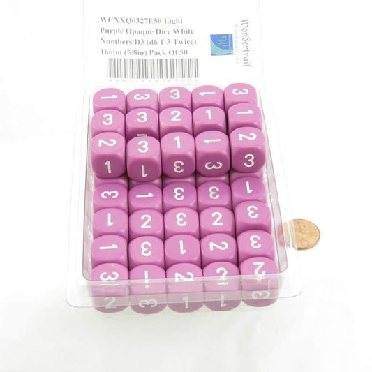 WCXXQ0327E50 Light Purple Opaque Dice White Numbers D3 (d6 1-3 Twice) 16mm (5/8in) Pack Of 50