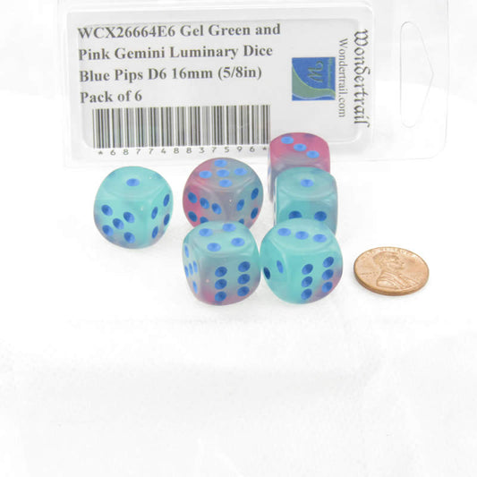 WCX26664E6 Gel Green and Pink Gemini Luminary Dice Blue Pips D6 16mm (5/8in) Pack of 6