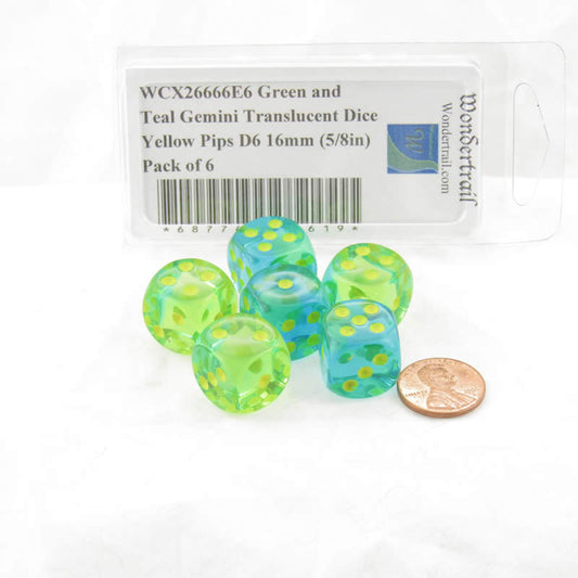 WCX26666E6 Green and Teal Gemini Translucent Dice Yellow Pips D6 16mm (5/8in) Pack of 6