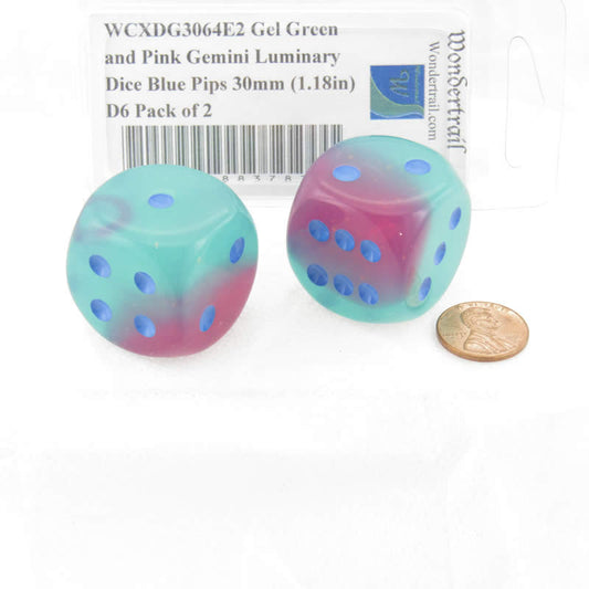 WCXDG3064E2 Gel Green and Pink Gemini Luminary Dice Blue Pips 30mm (1.18in) D6 Pack of 2