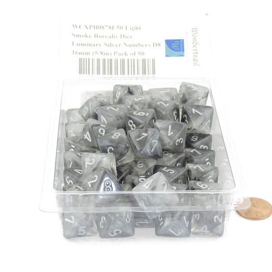 WCXPB0878E50 Light Smoke Borealis Dice Luminary Silver Numbers D8 16mm (5/8in) Pack of 50