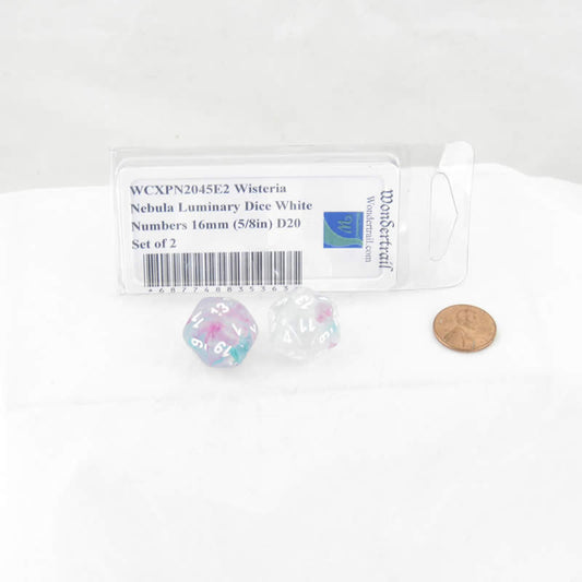 WCXPN2045E2 Wisteria Nebula Luminary Dice White Numbers 16mm (5/8in) D20 Set of 2