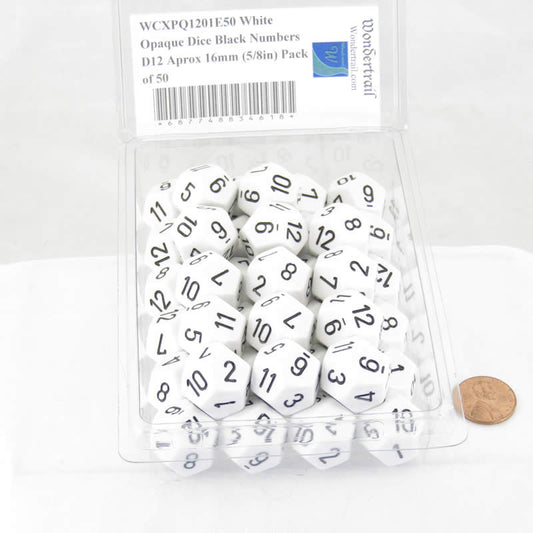 WCXPQ1201E50 White Opaque Dice Black Numbers D12 Aprox 16mm (5/8in) Pack of 50