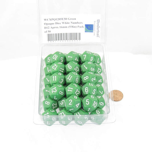 WCXPQ1205E50 Green Opaque Dice White Numbers D12 Aprox 16mm (5/8in) Pack of 50