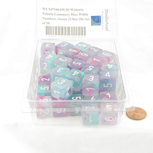 WCXPN0645E50 Wisteria Nebula Luminary Dice White Numbers 16mm (5/8in) D6 Set of 50
