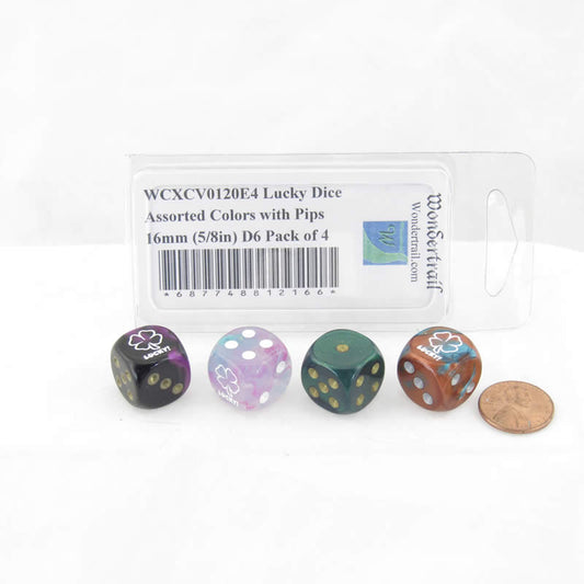 WCXCV0120E4 Lucky Dice Assorted Colors with Pips 16mm (5/8in) D6 Pack of 4
