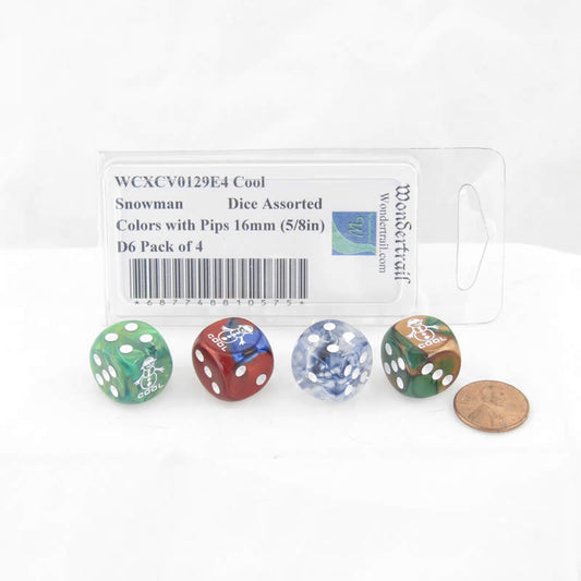 WCXCV0129E4 Cool Snowman Dice Assorted Colors with Pips 16mm (5/8in) D6 Pack of 4