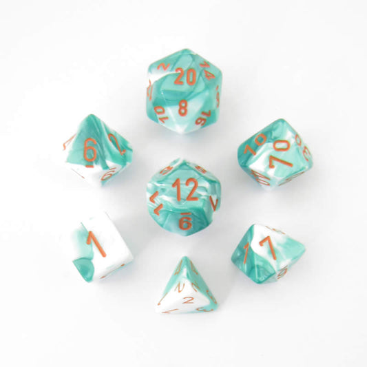 CHX30020 Mint Green White Gemini Dice Orange Numbers 16mm (5/8in) Set of 7