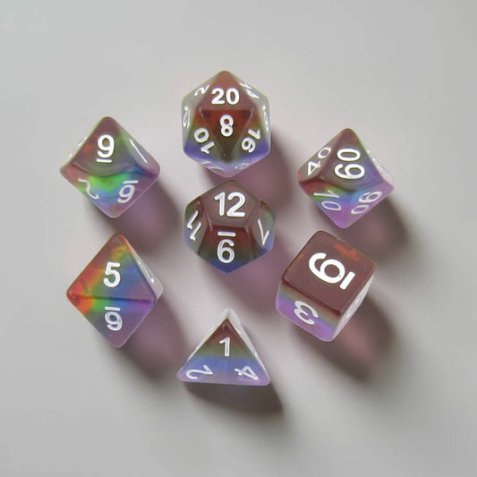 MET677 Translucent Rainbow Dice with White Numbers Acrylic 7 Dice Set