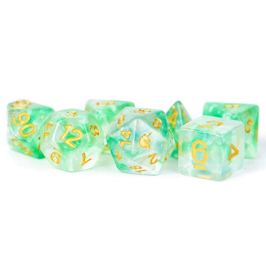 MET709 Icy Everglades Unicorn Dice with Yellow Numbers Acrylic 7 Dice Set