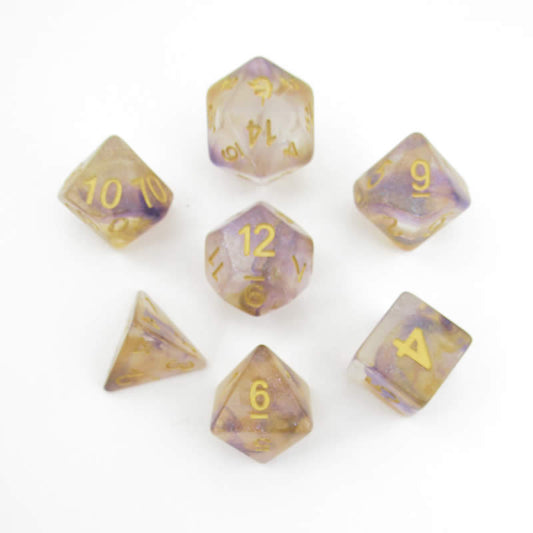 MET711 Royal Sunset Unicorn Dice with Yellow Numbers Acrylic 7 Dice Set