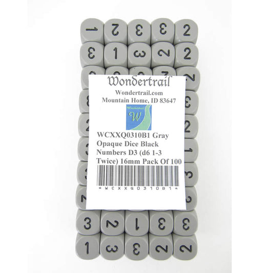 WCXXQ0310B1 Gray Opaque Dice Black Numbers D3 (d6 1-3 Twice) 16mm Pack of 100