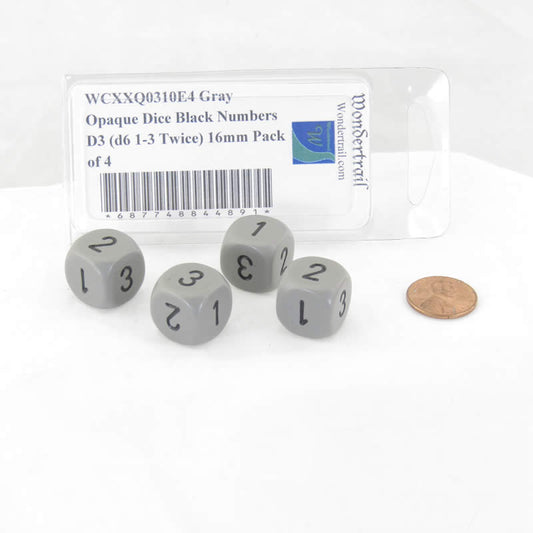 WCXXQ0310E4 Gray Opaque Dice Black Numbers D3 (d6 1-3 Twice) 16mm Pack of 4