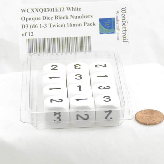 WCXXQ0301E12 White Opaque Dice Black Numbers D3 (d6 1-3 Twice) 16mm Pack of 12
