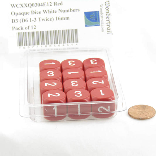 WCXXQ0304E12 Red Opaque Dice White Numbers D3 (D6 1-3 Twice) 16mm Pack of 12