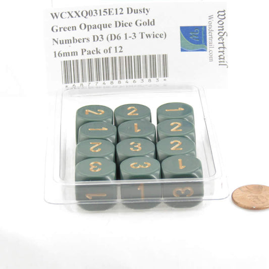 WCXXQ0315E12 Dusty Green Opaque Dice Gold Numbers D3 (D6 1-3 Twice) 16mm Pack of 12