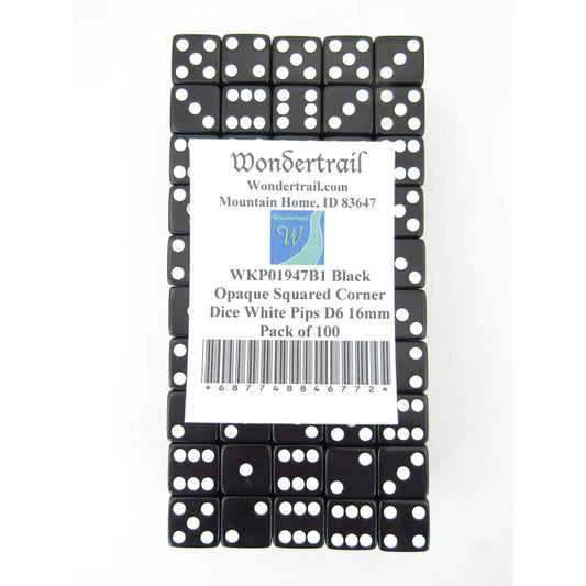 WKP01947B1 Black Opaque Squared Corner Dice White Pips D6 16mm Pack of 100