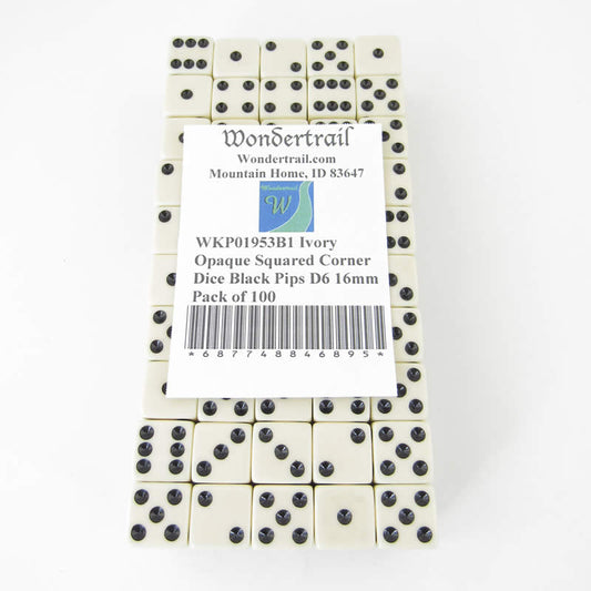 WKP01953B1 Ivory Opaque Squared Corner Dice Black Pips D6 16mm Pack of 100