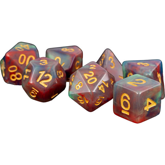 MET611 Red Pearl Swirl With Gold Numbers 16mm (5/8in) Acrylic 7 Dice Set
