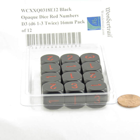 WCXXQ0318E12 Black Opaque Dice Red Numbers D3 (d6 1-3 Twice) 16mm Pack of 12