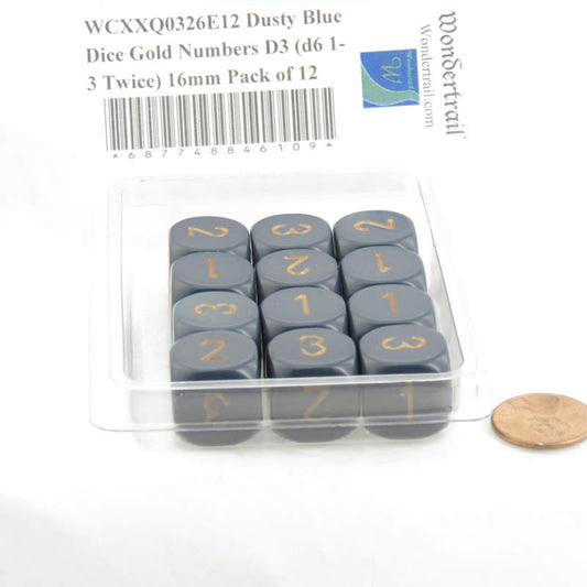 WCXXQ0326E12 Dusty Blue Dice Gold Numbers D3 (d6 1-3 Twice) 16mm Pack of 12