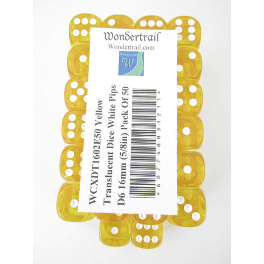 WCXDT1602E50 Yellow Translucent Dice White Pips D6 16mm Pack Of 50