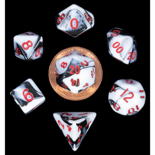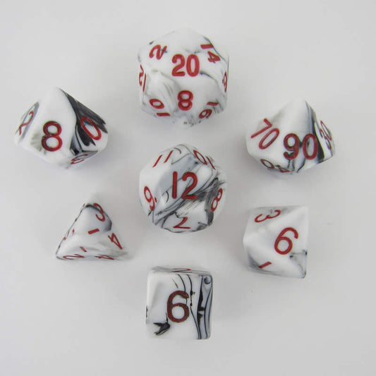 MET41031 Black and White Marble Colored Poly Dice Red Numbers 10mm 7-Dice Set