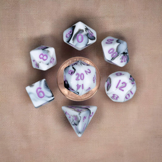 MET41037 Black and White Marble Colored Poly Dice Purple Numbers 10mm 7-Dice Set