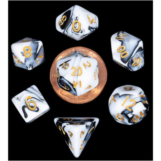 MET41038 Black and White Marble Colored Poly Dice Gold Numbers 10mm 7-Dice Set