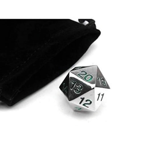 KOP18859 Metal Die Silver Colored Dice with Green Numbers Countdown D20 22mm (7/8in) 1 Die with Dice Bag