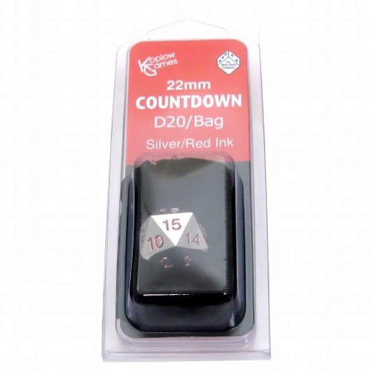 KOP18861 Metal Die Silver Colored Red Numbers Countdown D20 22mm 1 Die with Dice Bag Koplow Games