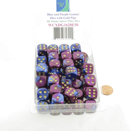 WCXDG1628E50 Blue Purple Gemini Dice Gold Pips D6 16mm Pack of 50