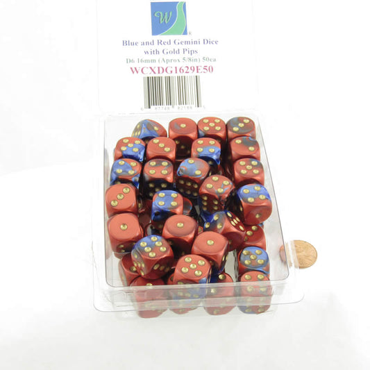 WCXDG1629E50 Blue Red Gemini Dice Gold Pips D6 16mm Bulk Pack of 50