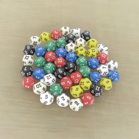 KOP02734 Assorted Opaque Dice Black Numbers D12 16mm Bulk Pack of 50