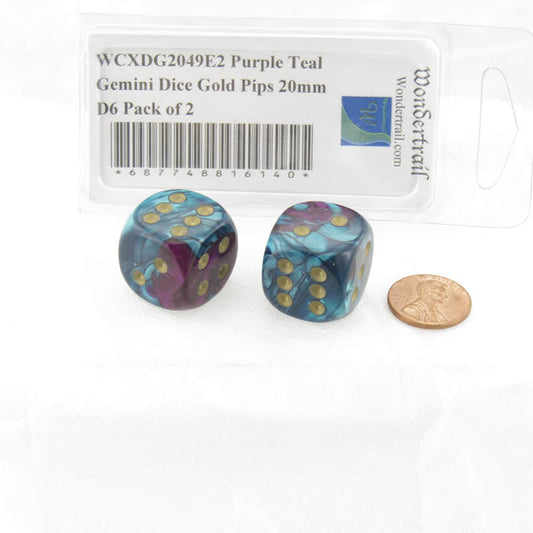 WCXDG2049E2 Purple Teal Gemini Dice Gold Pips 20mm D6 Pack of 2